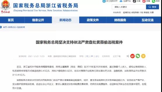12月20日,浙江省杭州市税务部门发布消息:经税收大数据分析发现网络主播黄薇(网名:薇娅)涉嫌偷逃税款。