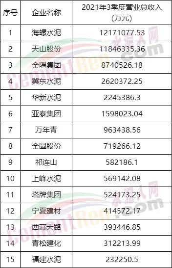 2021前3季度水泥上市公司营业总收入