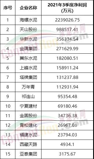 2021前3季度水泥上市公司净利润