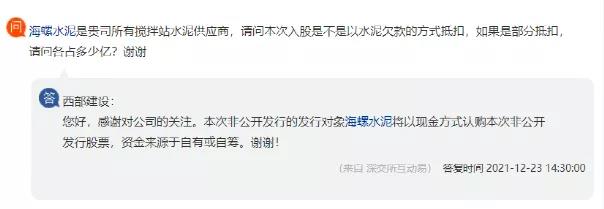 西部建设回复称,本次非公开发行的发行对象海螺水泥将以现金方式认购本次非公开发行股票,资金来源于自有或自筹。