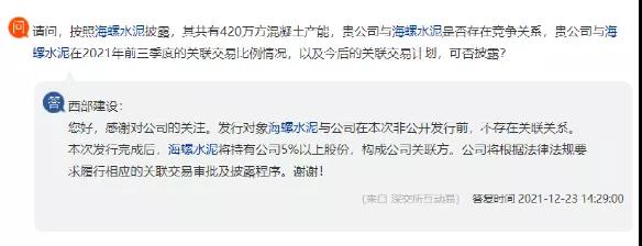 西部建设回复称,海螺水泥与公司在本次非公开发行前,不存在关联关系。本次发行完成后,海螺水泥将持有公司5%以上股份,构成公司关联方。