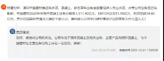 “西部建设分布在全国各地区的搅拌站都从该地区的海螺水泥厂或者经销商那里采购,它是海螺水泥的大客户。而海螺水泥也有规模不小的混凝土、沙石骨料业务,未来将与西部建设协同发展。”消息人士称。
