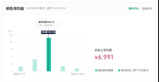 销售岗位24条用户薪资,月收平均值为6991元,最高16900元/月,最低1716元/月,45%的员工薪资高于平均水平。拥有3年经验的商务经理月薪为16900元,1年以下经验的普遍销售员月薪1716-2700元。拥有1年以上经验的销售员月薪在5300元左右。