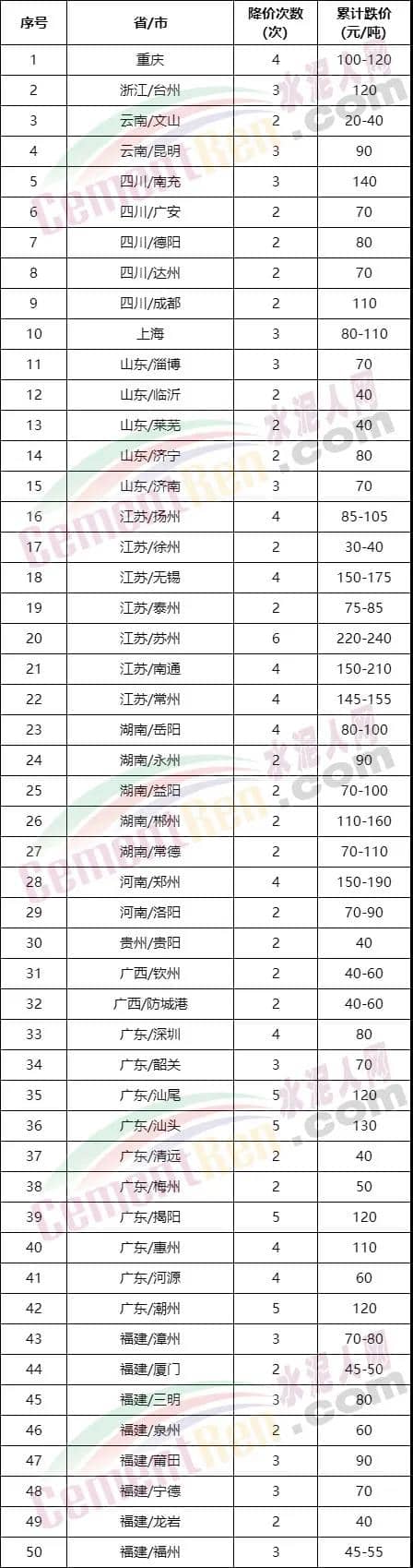 12月份多区域水泥价格持续下跌中,据不完全统计,江苏苏州、南充等区域水泥价格月内下跌达到200元/吨以上,苏州区域6次下调水泥价格,累计跌价达到240元/吨。而且,除了江苏,浙江、山东、福建、四川、云南、贵州、湖南、河南、广东、广西、上海、重庆等10余个省市自治区50个区域水泥价格均经历了2次以上的下跌。