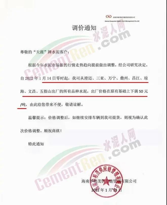 1月13日海南华裕茂供应链管理有限公司通知,根据今年水泥市场新的行情走势趋向提前做出调整。经公司研究决定,自2022年1月14日零时起,从澄迈、三亚、万宁、儋州、昌江、琼海、文昌、五指山出厂的所有品种水泥,出厂价格在原有基础上下调50元/吨。