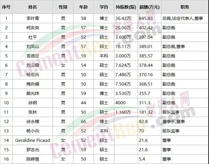 华新水泥已公布薪酬的16位高管中总裁李叶青薪酬为845.83万元为所有水泥上市企业高管中薪酬最高的一位。副总裁柯友良年薪402.42万元位于“薪酬榜”第二位,副总裁杜平、刘凤山、袁德足、刘云霞、杨宏兵、梅向福、熊光炜、徐钢等8位副总裁分列第3~10位,薪酬均在300万元以上。相比较而言海螺水泥总经理李群峰年薪249.7万元,吴斌、李乐意、柯秋璧、李晓波、虞水等5位高管年薪也只达到200万元以上。而冀东水泥董事长孔庆辉年薪188.9万元,还不到200万元。