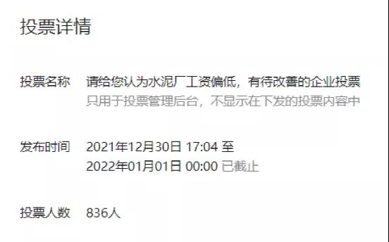 2021年最后一天,水泥人网发起了全网民调,结果显示有15%的网友投票海螺水泥,认为企业工资偏低,有待改善。