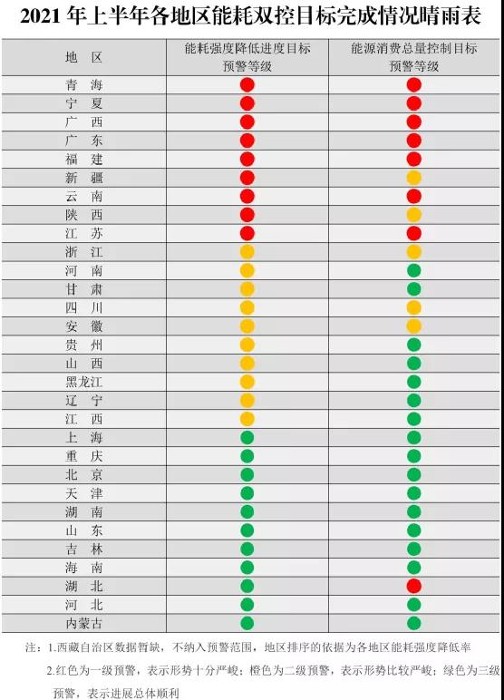 国家发展改革委印发《2021年上半年各地区能耗双控目标完成情况晴雨表》。青海、宁夏、广西、广东、福建、新疆、云南、陕西、江苏、浙江、安徽、四川等12个地区在能耗降低和能源消费总量方面均呈现严峻态势。全国有一半以上的省份,上半年“双控”目标都没完成,多区域采取最严格的限产、限电措施。