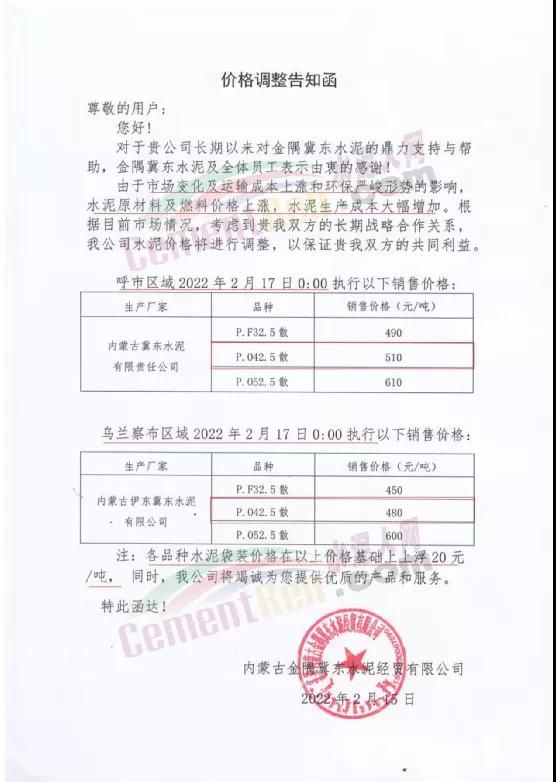 日前,内蒙古金隅冀东水泥经贸有限公司发布《价格调整告知函》称,由于市场变化及运输成本上涨和环保严峻形势的影响,水泥原材料及燃料价格上涨,水泥生产成本大幅增加。根据目前市场情况,上调公司水泥价格。呼市区域自2月17日0时起执行P.F32.5散490元/吨,P.O42.5散510元/吨,P.O52.5散610元/吨;