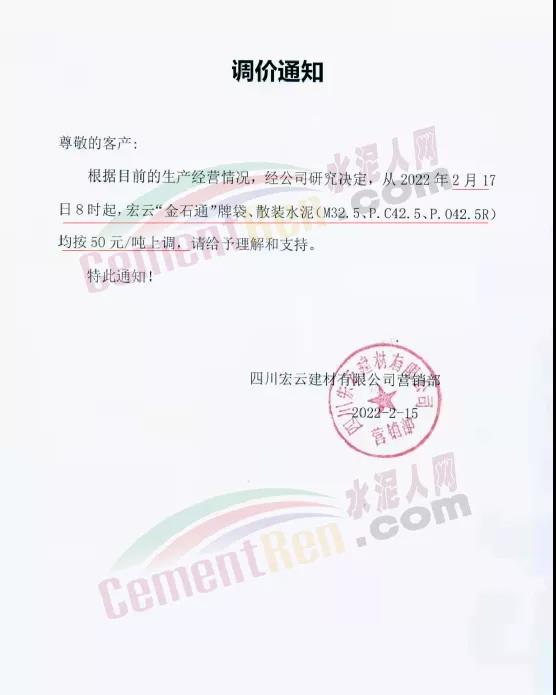 四川宏云建材有限公司营销部通知,根据目前的生产经营情况,经公司研究决定,从2022年2月17日8时起,宏云“金石通”牌袋、散装水泥(M32.5、P.C42.5、P.O42.5R)均按50元/吨上调。