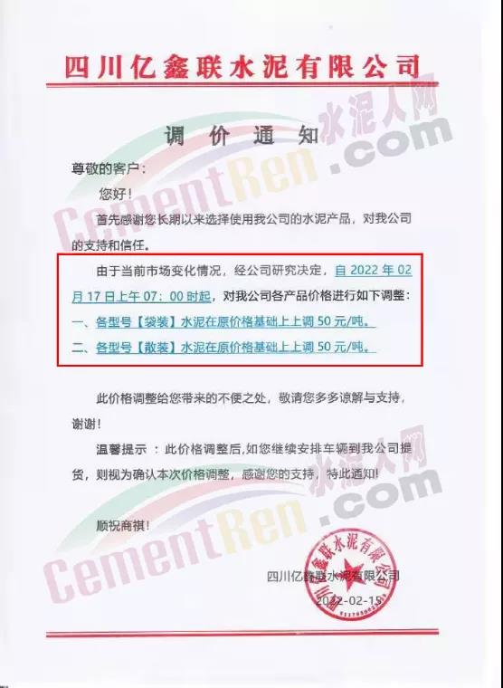 四川亿鑫联水泥有限公司通知,由于当前市场变化情况,经公司研究决定,自2022年2月17日上午7时起,对公司各产品价格进行调整。各型号水泥在原价格基础上上调50元/吨。