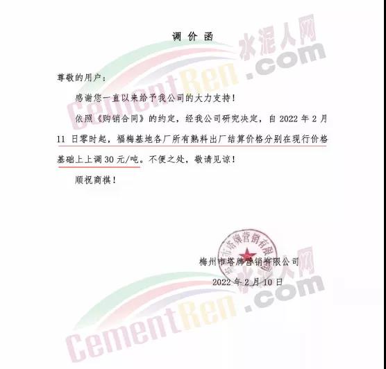 广东梅州塔牌水泥通知自2022年2月16日零时起,福梅基地各厂所有熟料出厂结算价格分别在现行价格基础上上调30元/吨。节后两次调涨累计涨60元/吨。