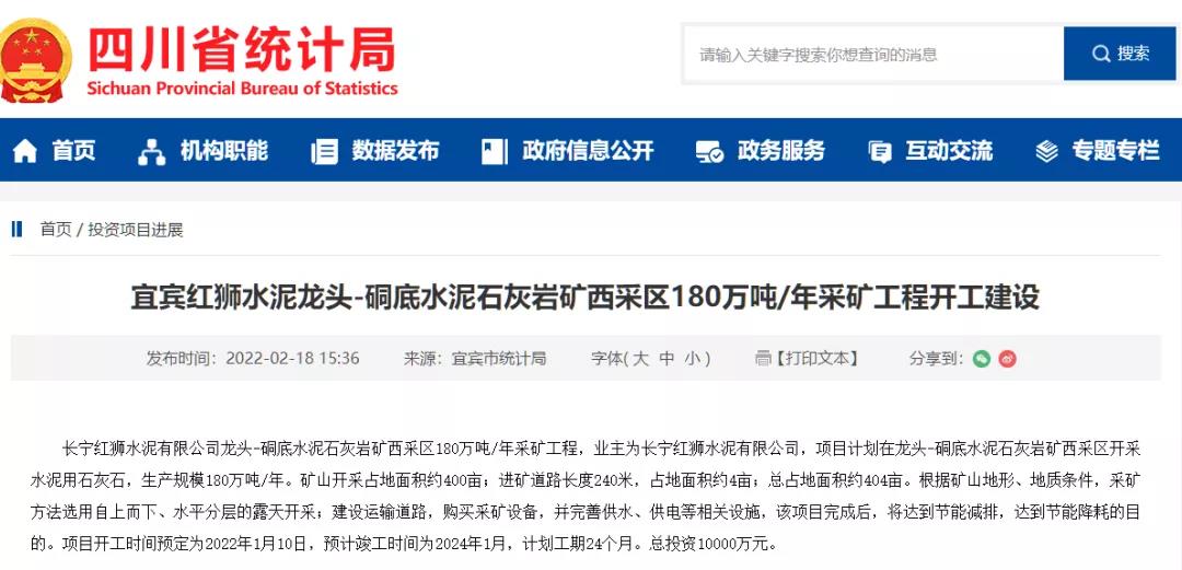 四川省统计局消息,长宁红狮水泥有限公司龙头-硐底水泥石灰岩矿西采区180万吨/年采矿工程,业主为长宁红狮水泥有限公司,项目计划在龙头-硐底水泥石灰岩矿西采区开采水泥用石灰石,生产规模180万吨/年。