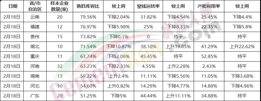 据水泥人网信息中心数据,绝大多数区域样本企业库容比均有下降,产能利用率小幅回升。截止2月18日,水泥人网重点监控的近三百家水泥企业,熟料库容比64.17%,较上周小幅下降。窑线运转率33.33%,产能利用率35.91%,较上周均有上升。