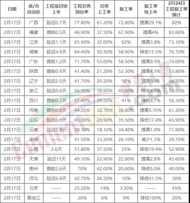 工程方面,以上19个省市自治区中福建、广东、陕西 、四川、河南、贵州等6个省较上年同期有所提前,其中贵州省提前了2.6天。黑龙江、河北、贵州、山东、山西、四川、浙江、湖南等省复工率较上年均有降低,黑龙江工程复工率为0,工程劳动到位率仅为20%。预计本月24日前后,上述19个省市自治工程复工率最高可达80%。