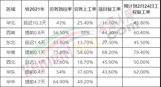 分区域来看,华中地区较2021年提前了4.7天,劳务到位率及上工率达到64.9%、49.2%;华南地区劳务到工率达到75.8%,上工率达到58.6%。