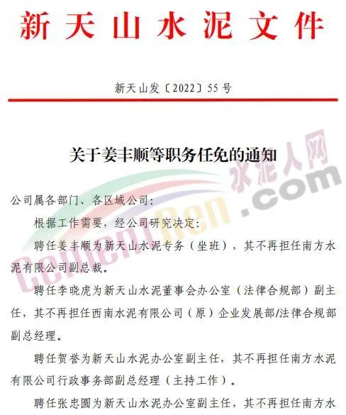 近日,新天山水泥发布吧《关于姜丰顺等职务任免的通知》,通知提到,根据工作需要,经新天山水泥研究决定,做出以下任免安排: