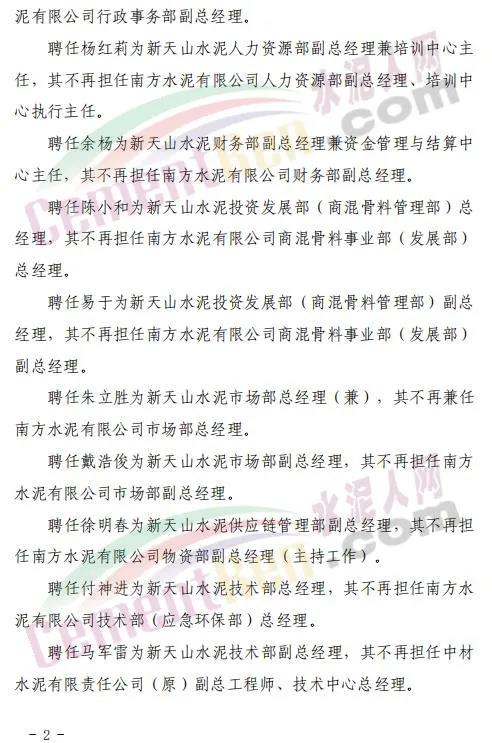 聘任陈小和为新天山水泥投资发展部(商混骨料管理部)总经理,其不再担任南方水泥有限公司商混骨料事业部(发展部)总经理。