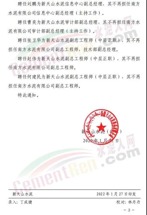 聘任何建民为新天山水泥副总工程师(中层正职),其不再担任南方水泥有限公司副总工程师。