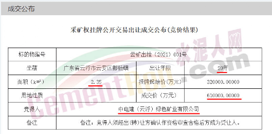 日前,中电建(云浮)绿色矿业有限公司以61亿天价拍下云浮市云安区都杨镇观音山矿区建筑用花岗岩矿采矿权,刷新了2022年矿权出让记录,这也意味着海螺水泥又一次痛失“采矿权”。