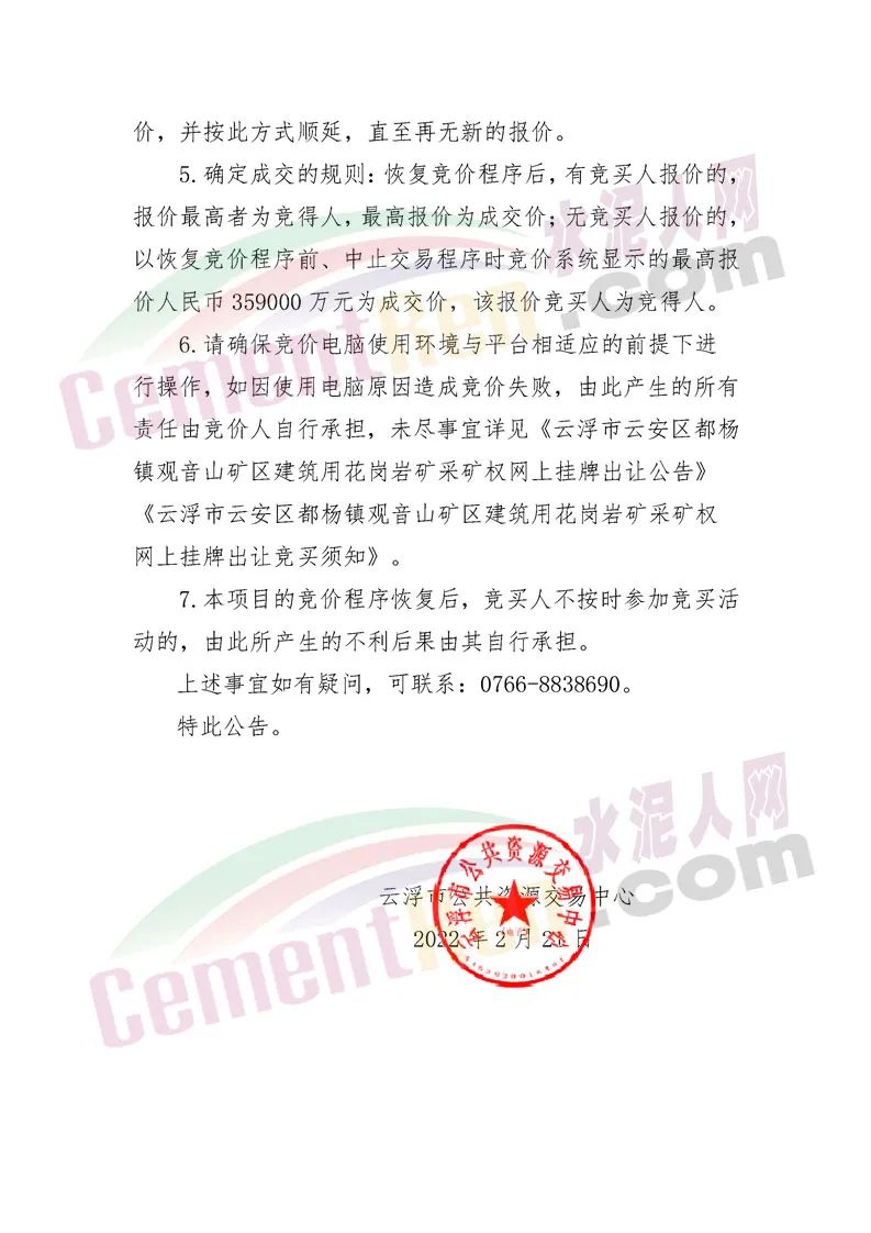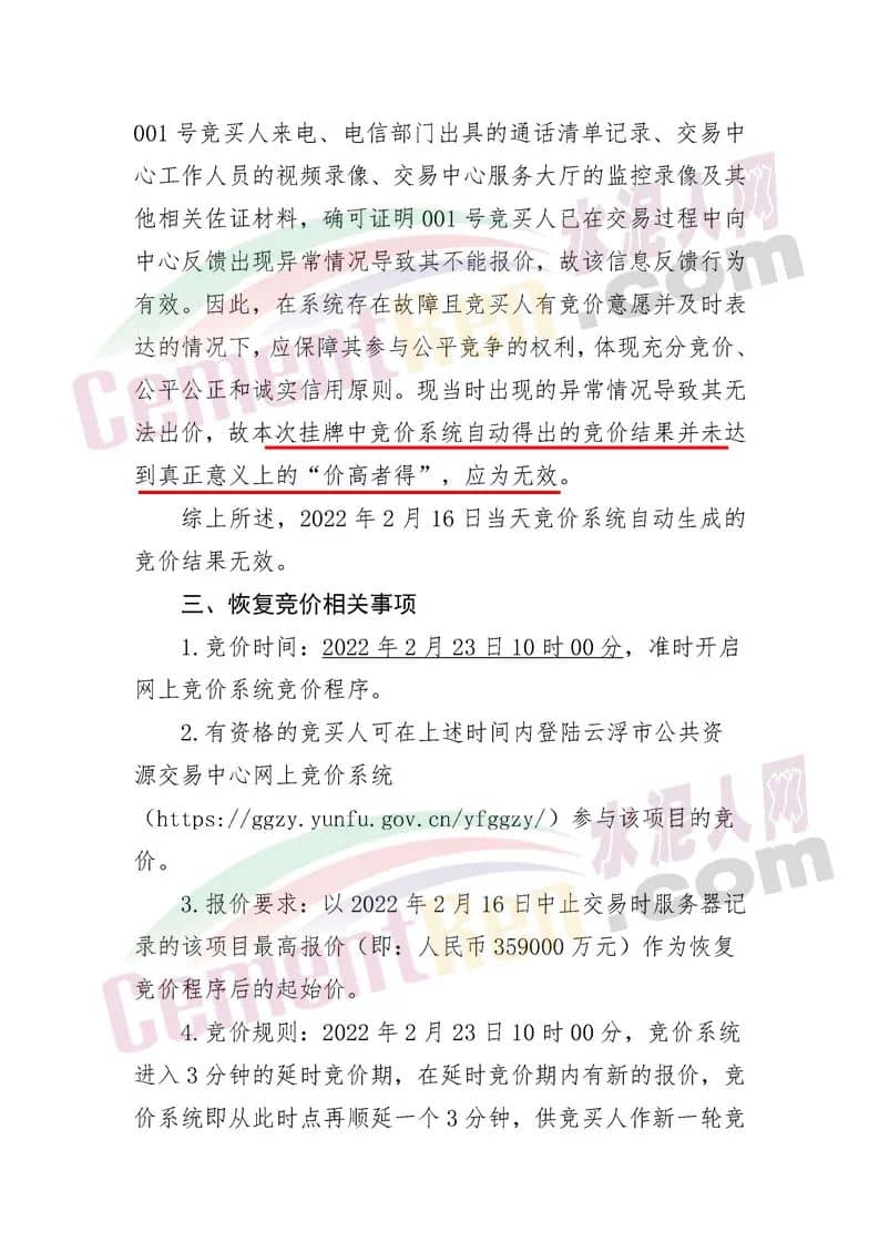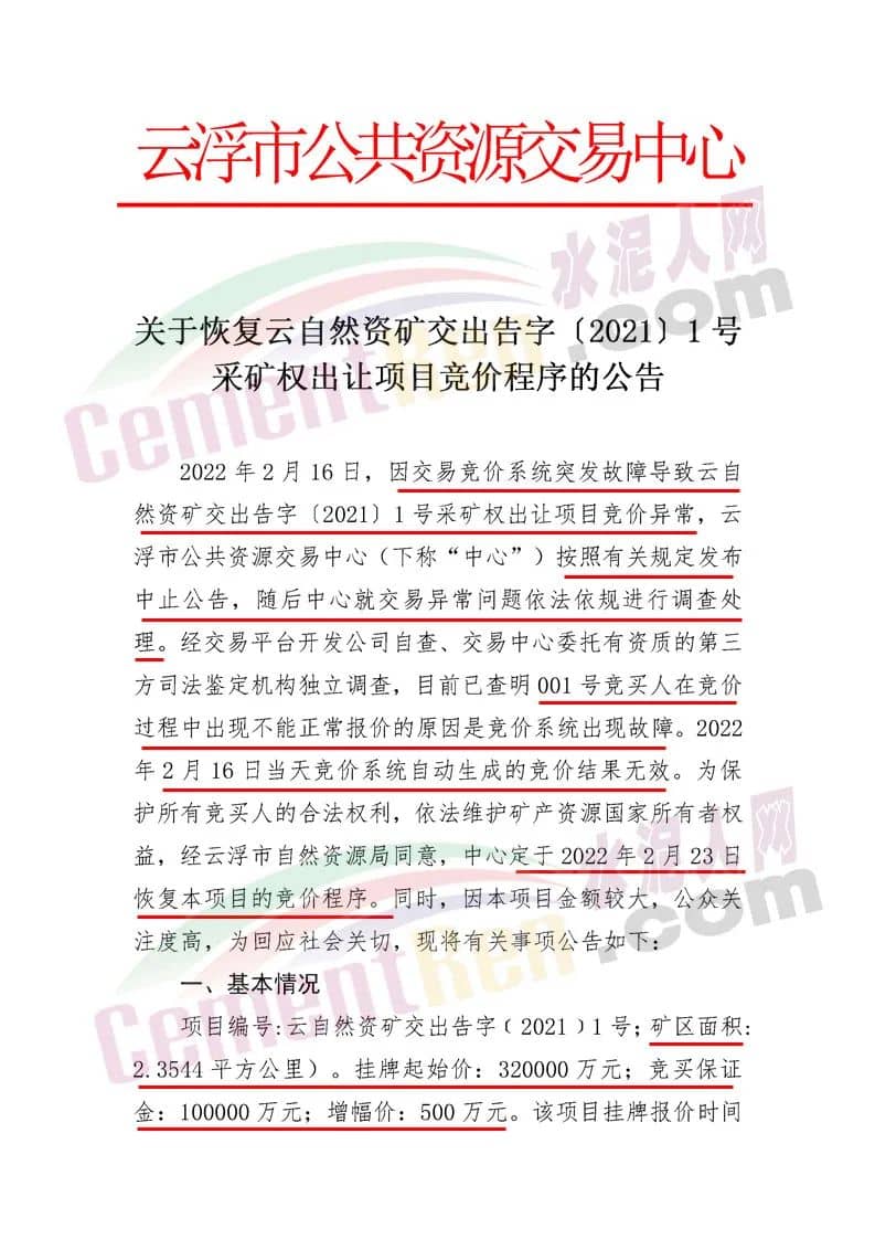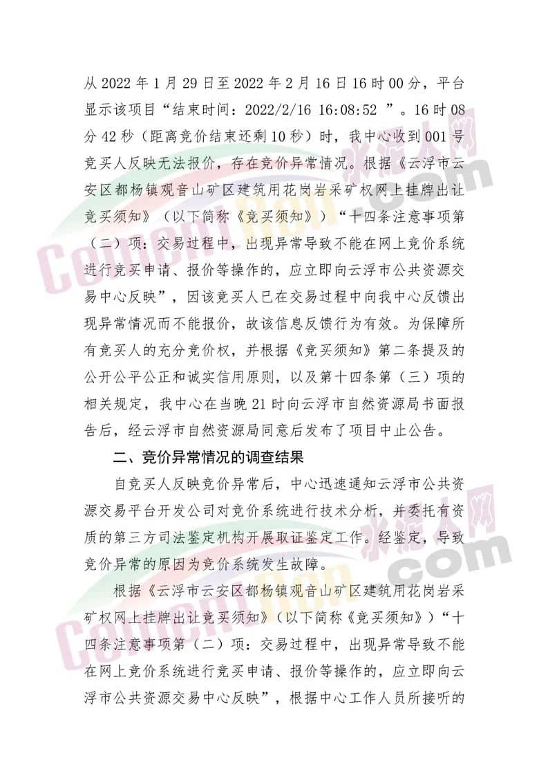 云浮市公共资源交易中心《关于恢复云自然资矿交出告字(2021〕1号采矿权出让项目竞价程序的公告》称,经查明001号竞买人在竞价过程中出现不能正常报价的原因是竞价系统出现故障。2022年2月16日当天竞价系统自动生成的竞价结果无效。
