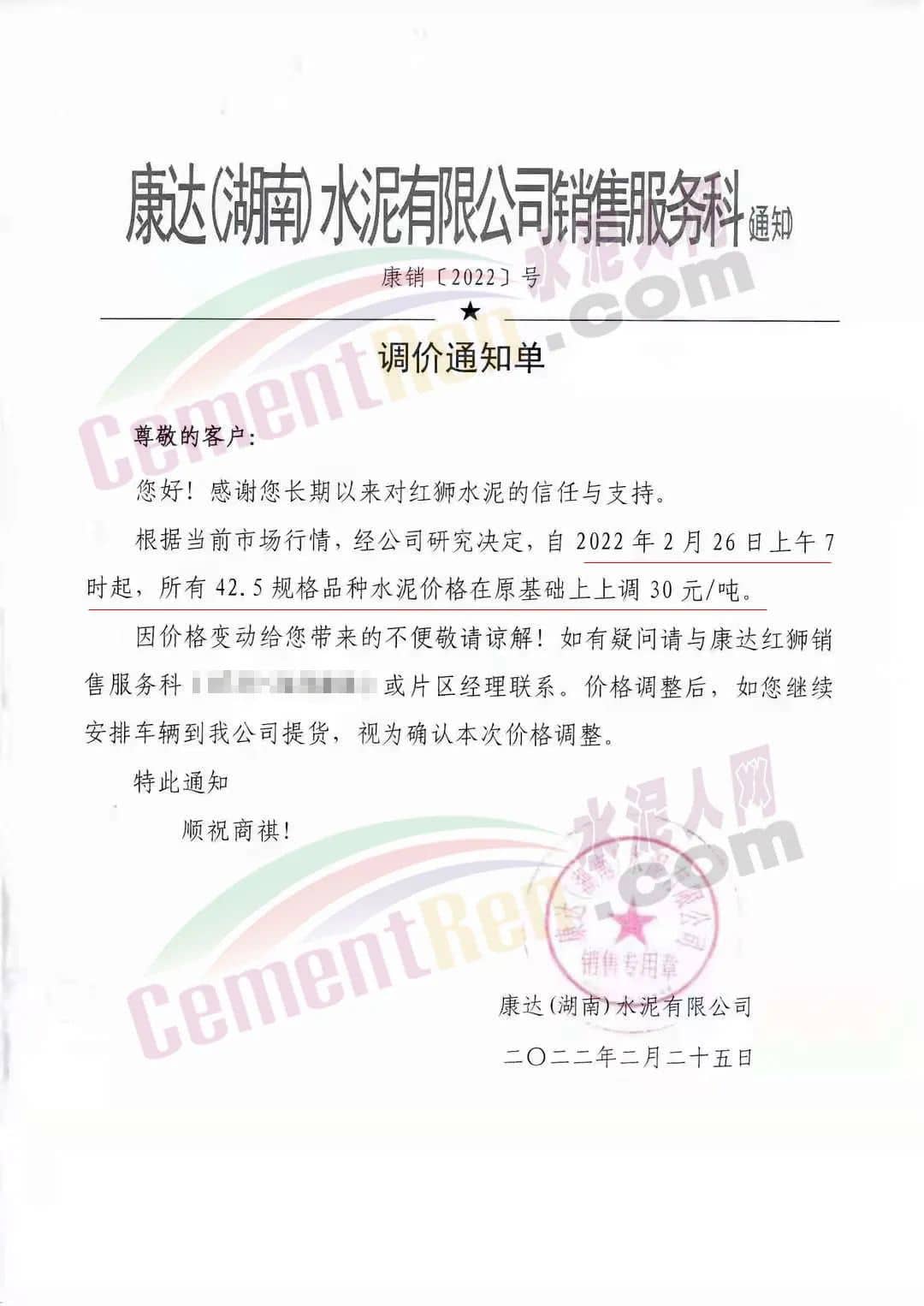 水泥人网通讯员消息,日前,红狮水泥旗下康达(湖南)水泥有限公司销售服务科通知,根据当前市场行情 ,经公司研究决定自2月26日上午7时起,所有42.5水泥在原基础上上调30元/吨。