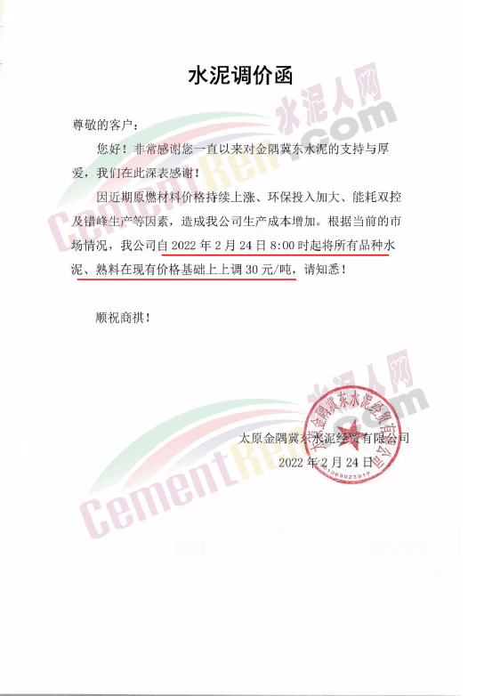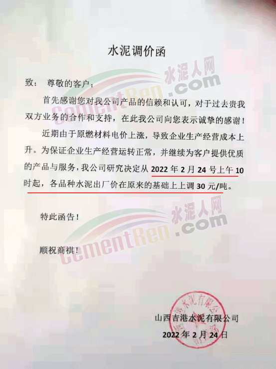 山西吉港水泥有限公司通知,由于原燃材料电价上涨,导致企业生产经营成本上升,为保证企业生产经营运转正常,经公司研究决定从2月24日上午10时起,各品种水泥出厂价在原基础上上调30元/吨。