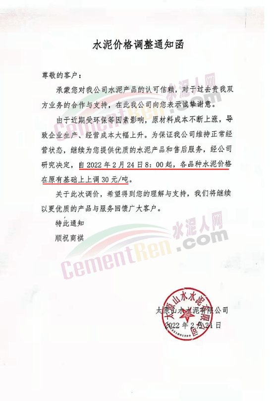 太原山水水泥有限公司通知由于近期受环保等因素影响,原材料成本不断上涨,导致企业生产、经营成本大幅上升,为保证公司正常经营,经公司研究决定,自2月24日 8时起,各品种水泥价格在原有基础上上调30元/吨。