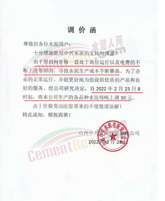 山西中兴水泥有限公司通知,由于原材料价格一直处于高位运行以及电费的不断上涨等原因,导致水泥生产成本不断攀高。为了企业的正常运行,经公司研究决定,自2月23日8时起,将公司生产的各品种水泥上调30元/吨。