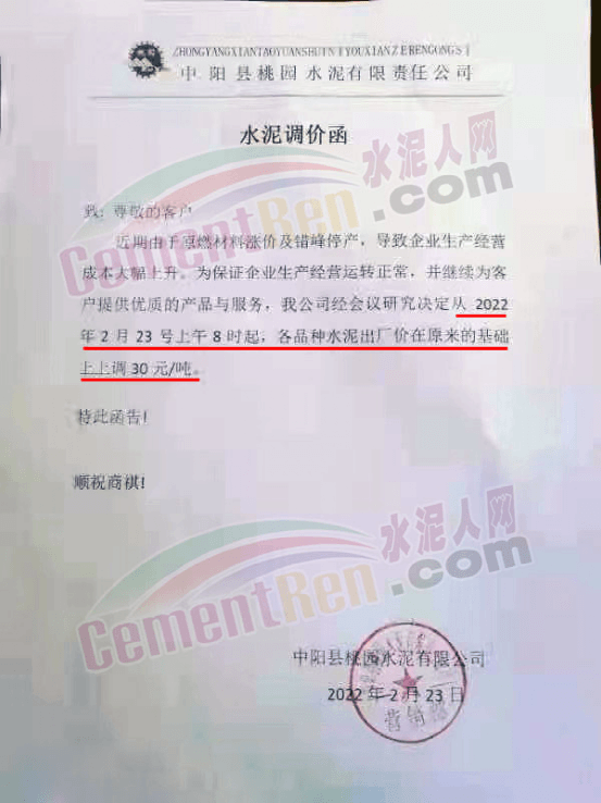 中阳县桃园水泥有限公司通知,由于原燃材料涨价及错峰停产,导致企业生产经营成本大幅上升,为保证企业生产经营运转正常,经研究决定从2月23日上午8时起,各品种水泥出厂价在原基础上上调30元/吨。