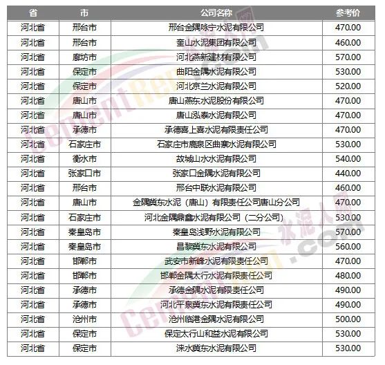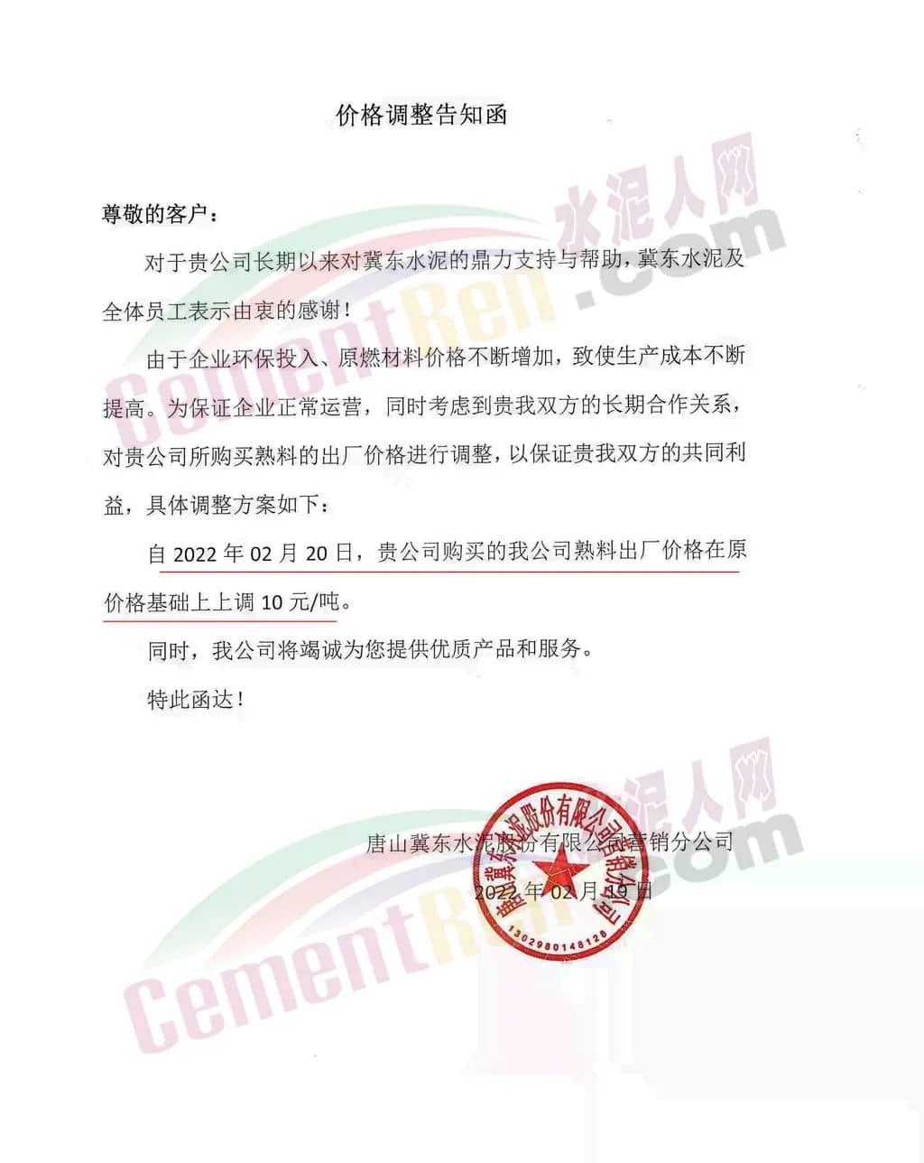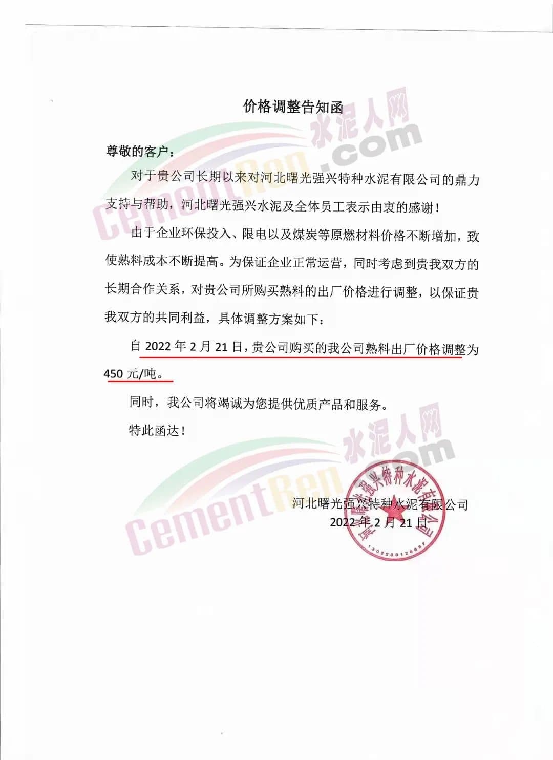 滦县磐石水泥有限公司及河北曙光强兴特种水泥有限公司通知,由于环保投入、限电以及煤炭等原燃材料价格不断增加,致使熟料成本不断提高。为保证企业正常运营,自2月21日起公司熟料出厂价格调整为450元/吨。