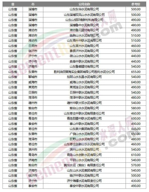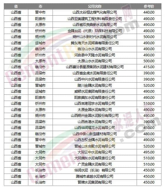 附:晋冀鲁豫京津P.O42.5散装水泥参考价格