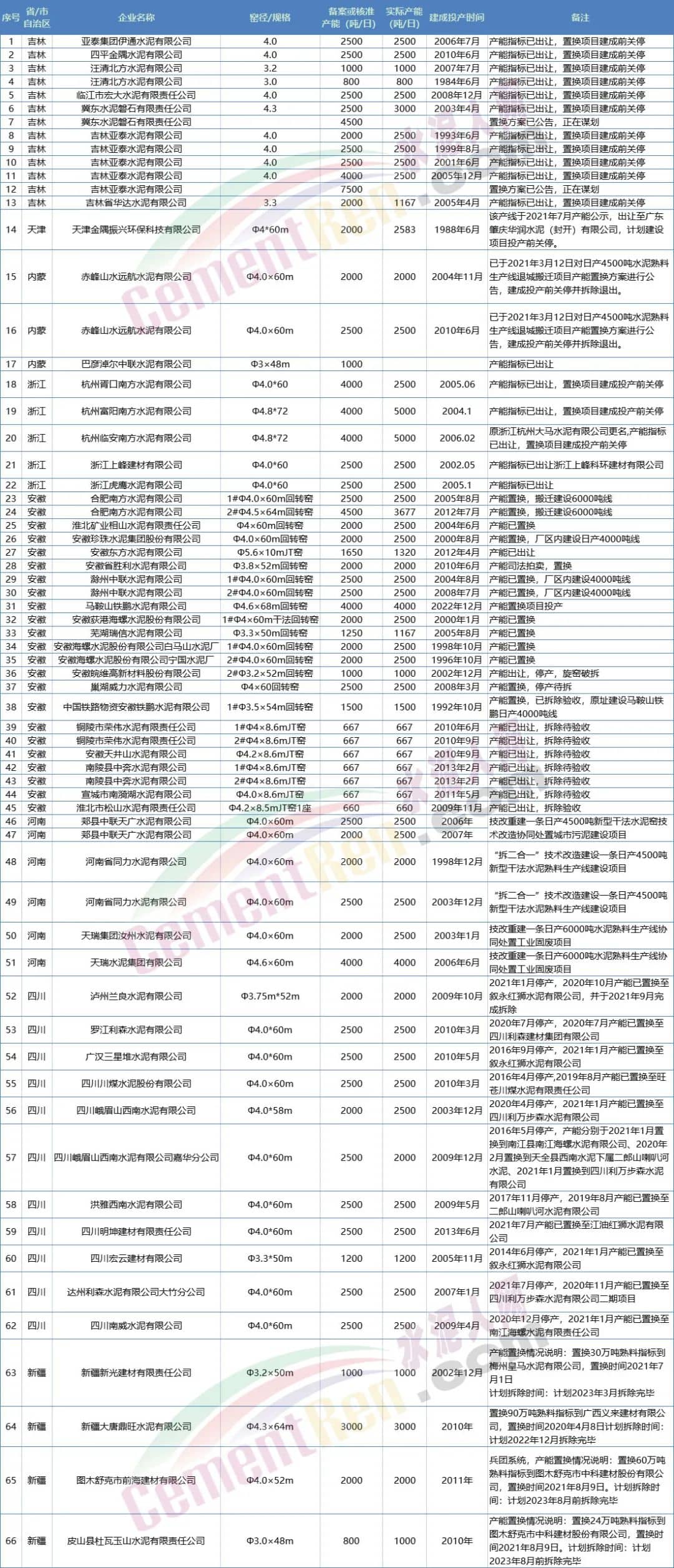 近日吉林、天津、内蒙、浙江、安徽、山东 、河南、四川、云南、新疆、宁夏等多个省市自治区公布了截止2021年底水泥熟料生产线清单,其中明确提到各区域产能置换退出生产线清单。据不完全统计合计退出66条生产线,合计产能达4465.86万吨/年。