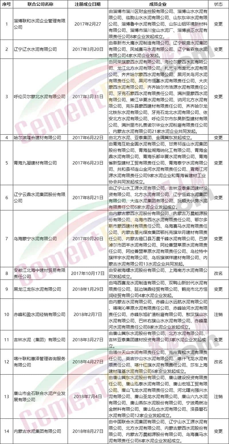 据查询,自2017年以来国内行业成立的水泥区域联合公司共14家。