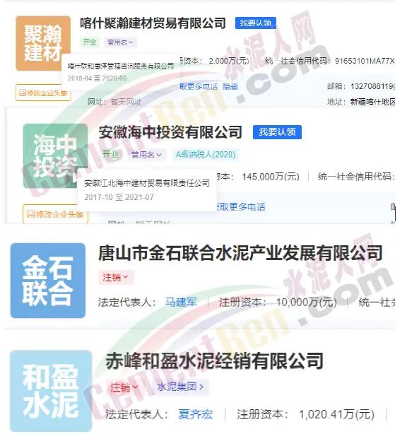 据爱企查数据显示,截止目前上述联合水泥公司多数已经进行了变更。涉及企业名称、经营范围变更、人员变更、出资比例变更、市场主体类型变更以及股权变更等多个项目。其中,喀什联和惠泽管理咨询服务有限公司、安徽江北海中建材贸易有限责任公司两家企业已更名;唐山金石联合水泥产业发展有限公司、赤峰和盈水泥经销有限公司已为“注销”状态。