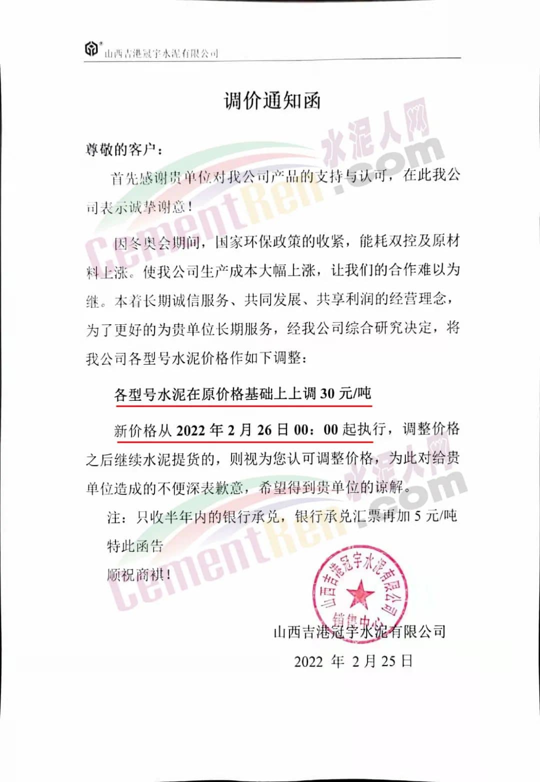水泥人网通讯员消息,日前山西吉港冠宇水泥有限公司发通知称,因近期环保政策收紧,能耗双控及原材料上涨。公司生产成本大幅上涨,经公司综合研究决定,将我公司各型号水泥价格在原价格基础上上调30元/吨。新价格从2022年2月26日0时起执行,调整价格之后继续水泥提货的,则视为认可调整价格。同时提到只收半年内的银行承兑,银行承兑汇票再加5元/吨。
