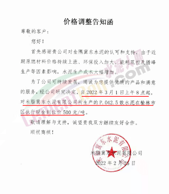 同期,陕西米脂冀东水泥通知由于近期原燃材料价格持续上涨、环保投入加大、能耗双控及错峰生产等因素影响,水泥生产成本大幅增加。为了公司可持续发展,经研究决定,自3月1日上午8时起,对米脂冀东水泥有限公司所生产的P.O42.5散装水泥在榆林市区域执行现金到位价500元/吨。