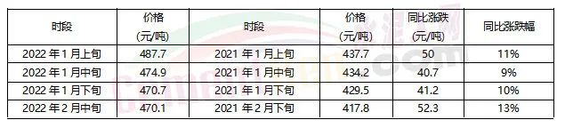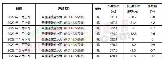 据国家统计局近日发布流通领域水泥市场价格变动情况数据可见2月中旬较节前水泥均价较节前下跌幅度收窄,P.O42.5散装水泥市场均价在470.1元/吨左右,较上期仅下跌0.5元/吨。同比上年同期,近期水泥市场均价高出40-50元/吨,涨幅达10%左右。国家统计局流通领域