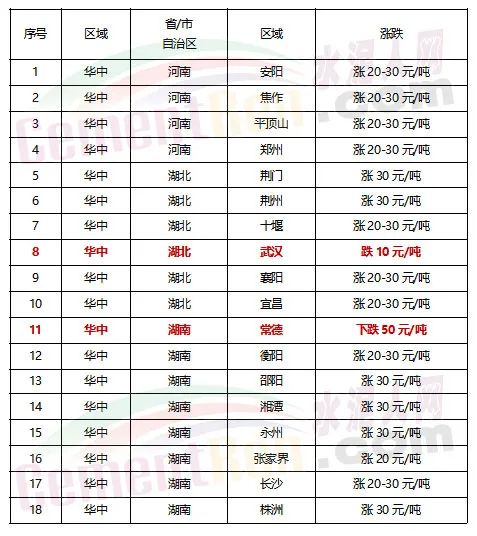 华中区域价格波动区域较广,涨跌互现,涨多跌少