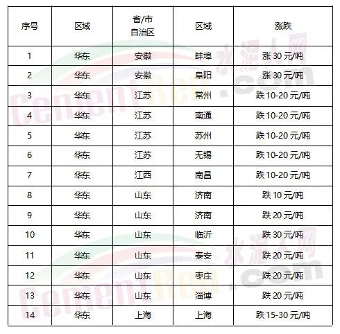 华东区域仅安徽蚌埠、阜阳两个区域部分企业通知上调水泥价格30元/吨,江苏、江西以及上海市区域水泥价格多为下跌。