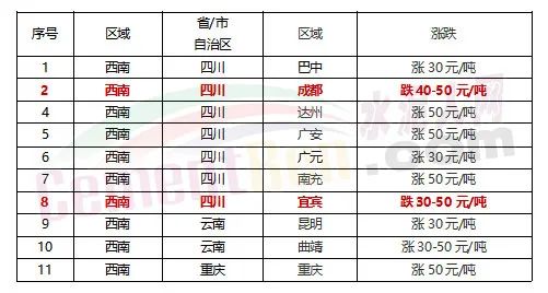 西南地区,四川巴中、达州、广安、广元、南充,云南昆明、曲靖以重庆区域上涨30-50元/吨,四川成都、宜宾报价下跌30-50元/吨。