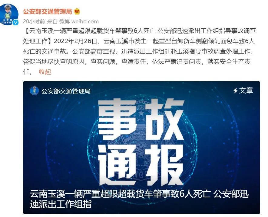 据公安部交通管理局微博消息,2022年2月26日,云南玉溪市发生一起重型自卸货车侧翻倾轧面包车致6人死亡的交通事故。公安部高度重视,迅速派出工作组赶赴玉溪指导事故调查处理工作,督促当地尽快查明原因,查实问题,查清责任,依法严肃追责问责,落实安全生产责任。