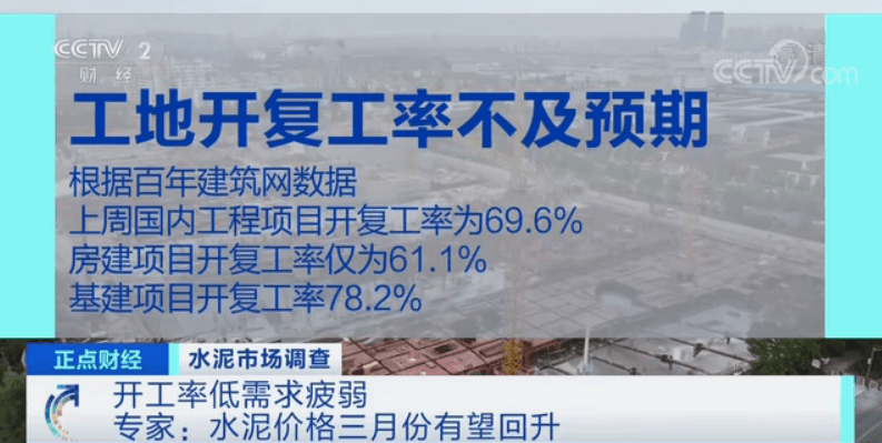 相关数据显示,上周国内工程项目开复工率为69.6%,同比下降17.3%,其中,房建项目表现不佳,开复工率仅为61.1%;基建开复工率78.2%。总体来看,二月份工地开工不及预期,导致水泥需求冷淡,抑制了水泥价格。由于下游的劳务到位,包括上工情况,节奏还是有点慢。只是从水泥混凝土砂石这个板块来看,目前这个销量同比去年下降20%到50%。