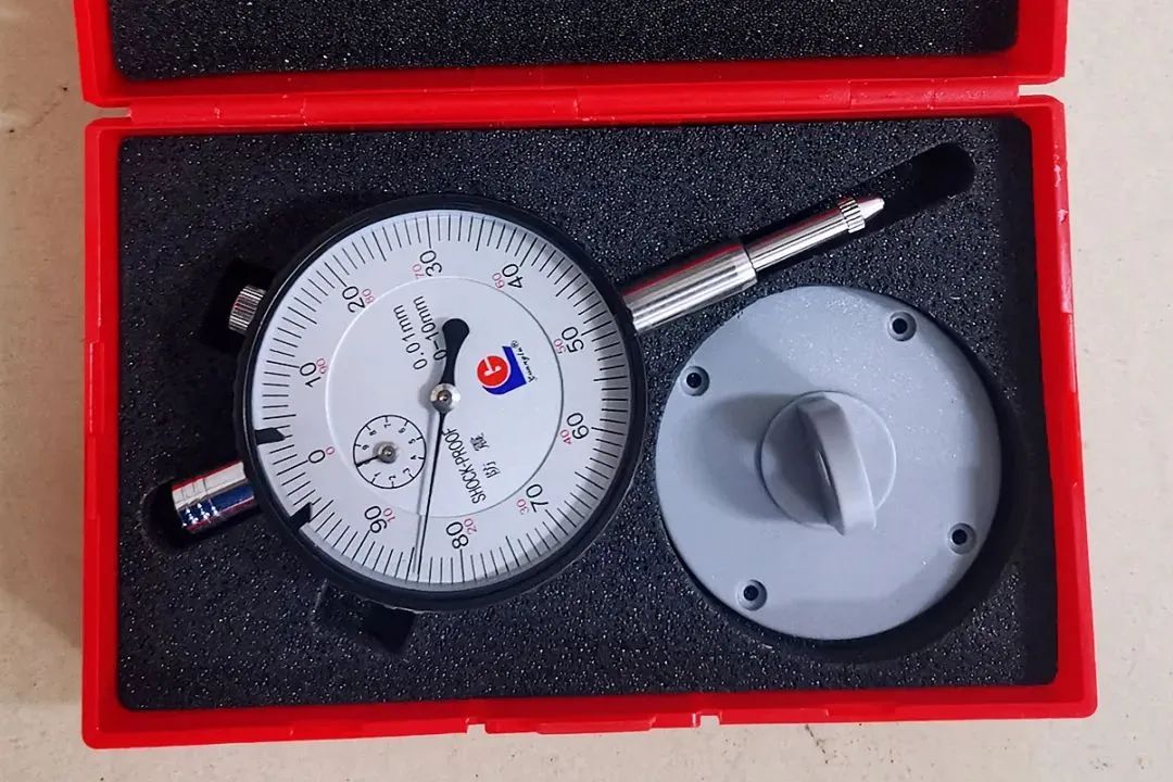 别看我个头小,测量配件的尺寸、形状,以及圆度、圆跳动、平面度等的误差都是我的功能,如果在检修过程中需要进行工件的精密找正,找我准没错。比如,技术人员在测量回转窑主减速机与主电机联轴器同轴度时用的就是我。不过我对自己的工作要求很高,我只接精度低于0.01mm的工作,想要测量更高精度请找我的“兄弟”千分表。在工作时要将我固定在可靠的夹持架上,表面粗糙的工件不要找我测量,否则会影响测量精度,这就是我,一个对精度要求很高的测量器具。