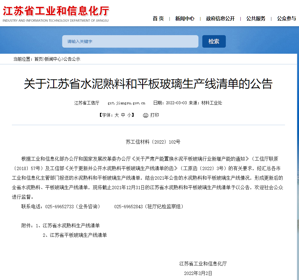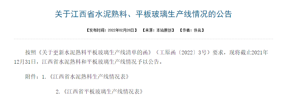 日前,江西省工业和信息化厅发布了江西省水泥熟料、平板玻璃生产线情况的公告。