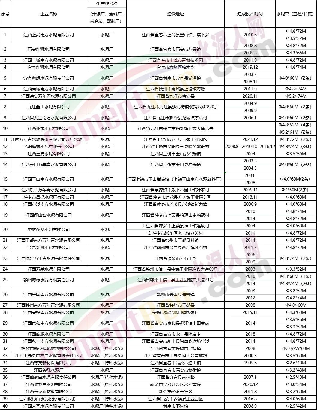 江西省水泥熟料生产线情况表