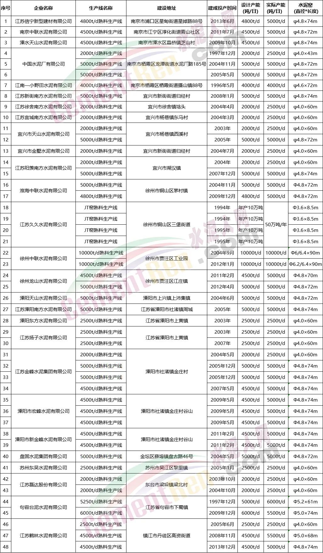 江苏省水泥熟料生产线清单