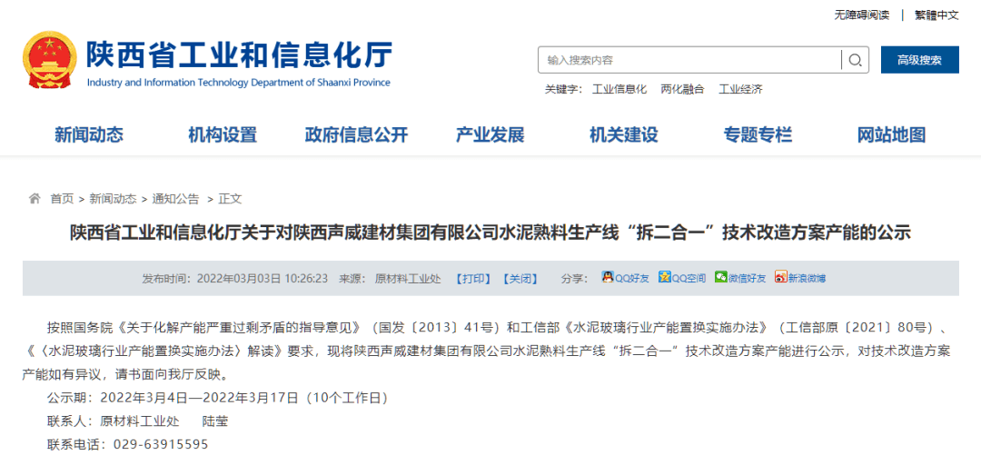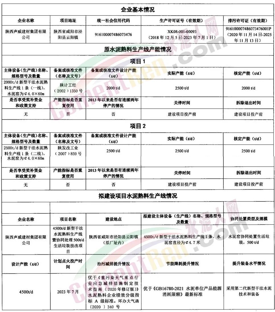 3月3日,陕西省工业和信息化厅发布《关于对陕西声威建材集团有限公司水泥熟料生产线“拆二合一”技术改造方案产能的公示》 。公示内容显示陕西声威建材集团有限公司拟通过拆除退出两条2500t/d熟料生产线,在原厂区内新建一条4500t/d新型干法水泥熟料生产线,配套协同处置500t/d生产垃圾项目。新建生产线将采用第二代新型干法水泥技术和装备 ,计划于2023年7月点火投产。