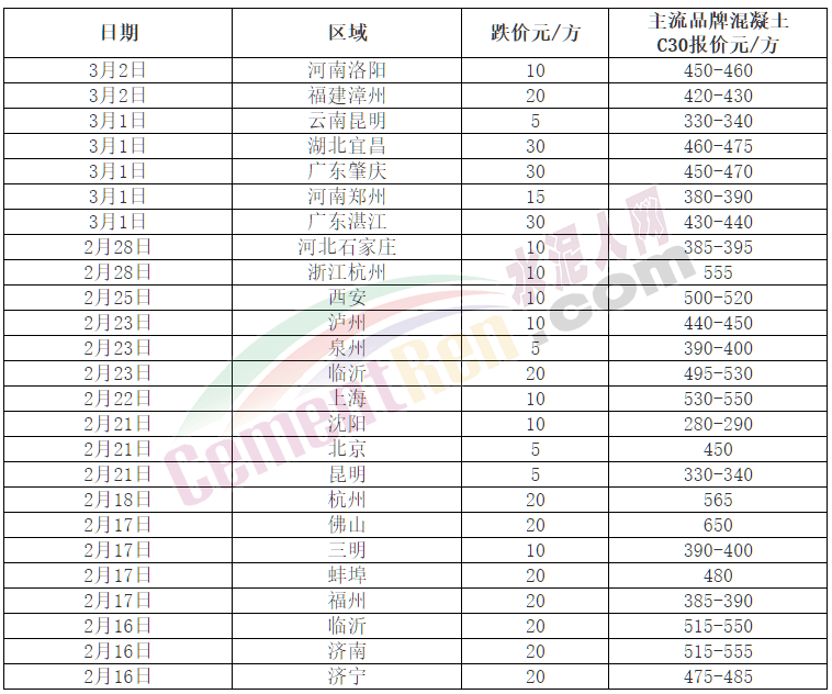 2月下旬至今,长三角、珠三角区域水泥价格预热,带动周边区域多企业上调水泥价格,但落地情况并不理想。同时湖南、河南、山东、云南等多个区域水泥价格出现回落。