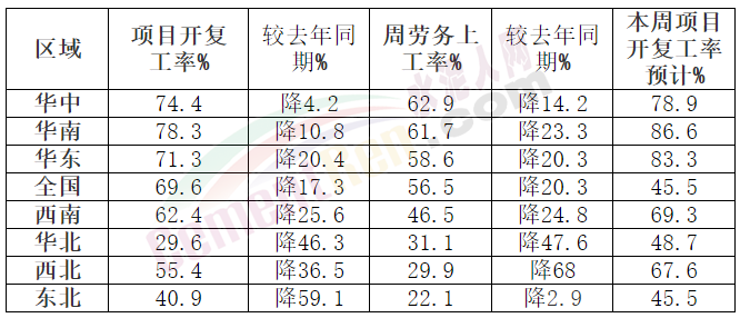 2月17日~2月24日全国12099工程项目开复工、劳务上工情况一览